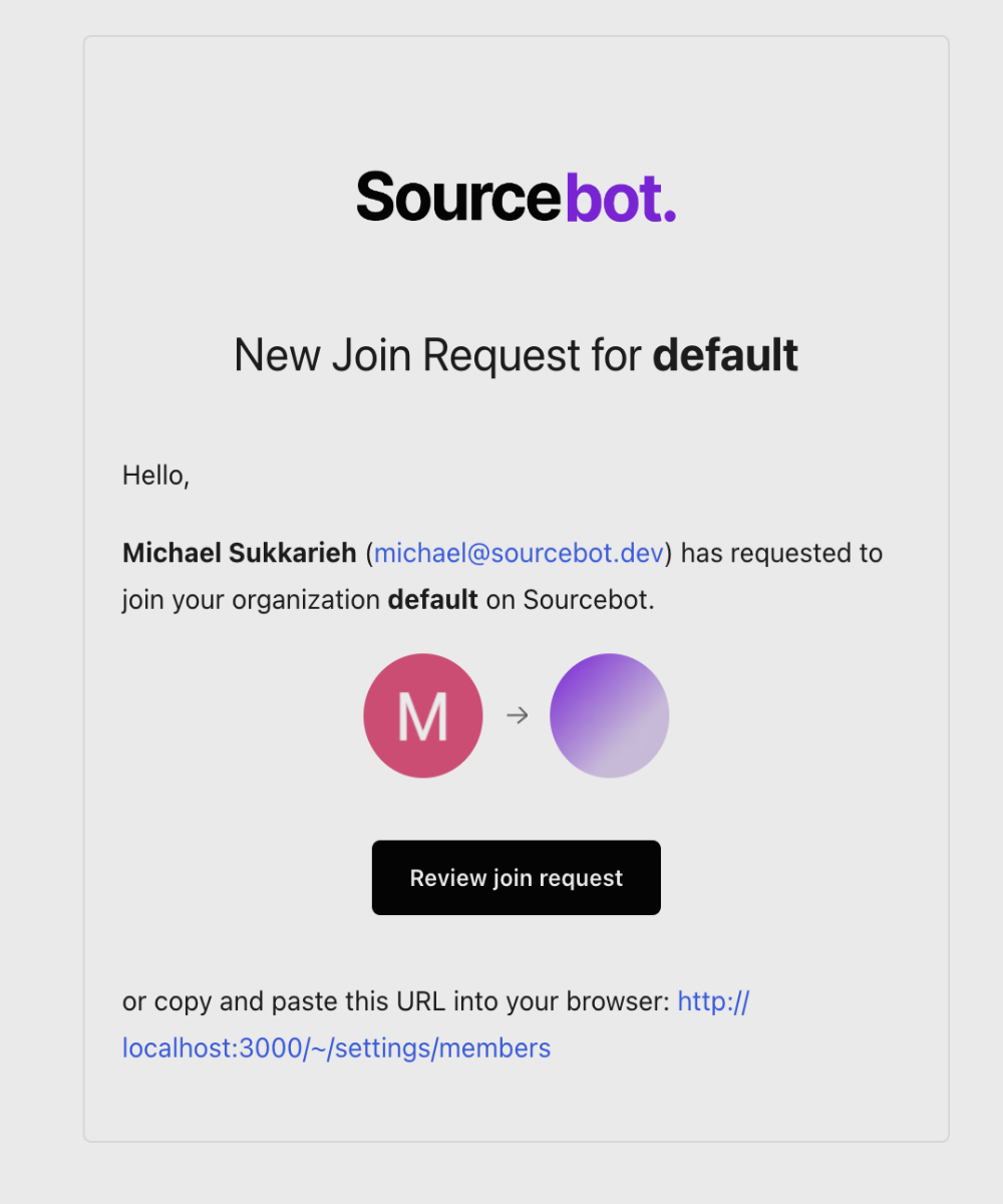 navigating to Settings -> Members. Emails can be sent on organization join request/approval by configuring transactional emails